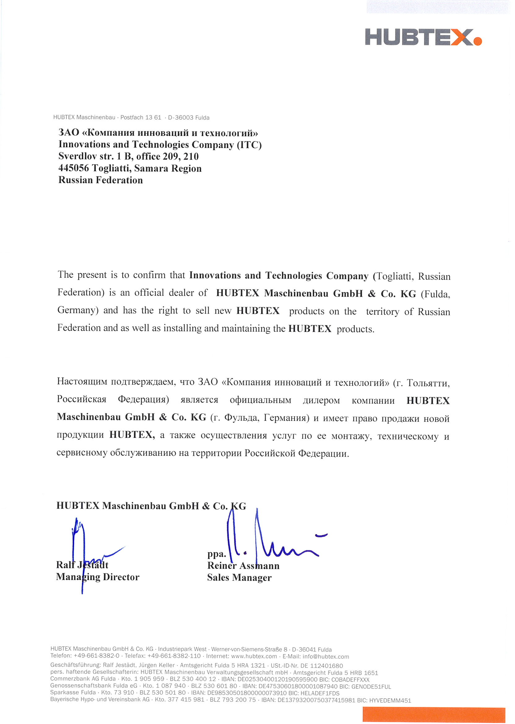 АО "Компания инноваций и технологий" - официальный дистрибьютор HUBTEX Maschinenbau GmbH & Co KG в России.