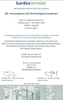 АО "Компания инноваций и технологий" официальный дистрибьютор компании KARDEX REMSTAR в России и имеет право продаж новой продукции KARDEX, а также осуществления услуг по ее монтажу, техническому и сервисному обслуживанию на всей территории Российской Федерации.