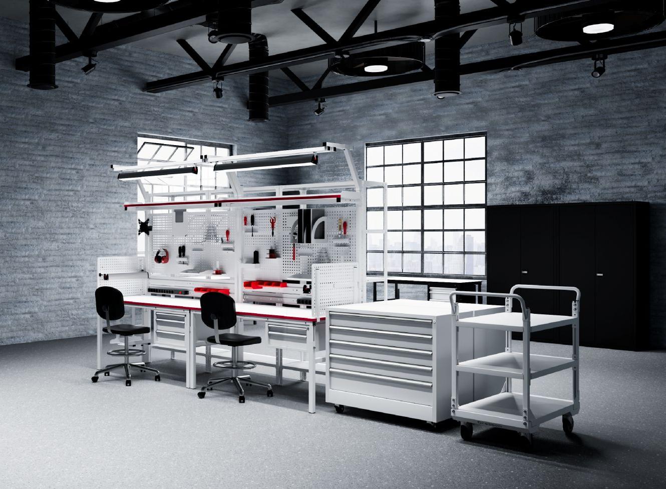 для организации рабочих мест на производственных участках, складах, в мастерских и лабораториях — места упаковщика, комплектовщика, монтажника, слесаря, оператора электронной сборки и других задач
