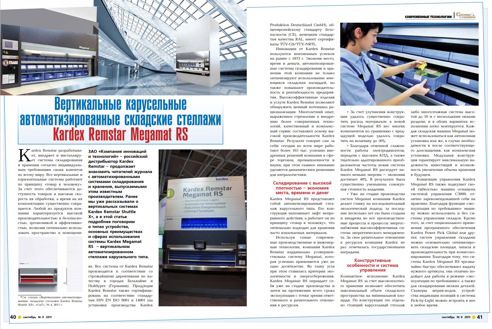 АО «Компания инноваций и технологий» – российский дистрибьютор Kardex Remstar – продолжает серию статей об автоматизированных системах складирования и хранения, выпускаемых этой компанией. Со статьей об «Вертикальных автоматизированных складских стеллажах Kardex Remstar Shuttle XP» вы можете познакомиться в апрельском выпуске №4 журнала «Склад и Техника». В этом выпуске «Склад и Техника» мы подробнее поговорим о типе устройства, основных преимуществах и сферах использования системы KARDEX MEGAMAT RS - вертикальном автоматизированном стеллаже карусельного типа.