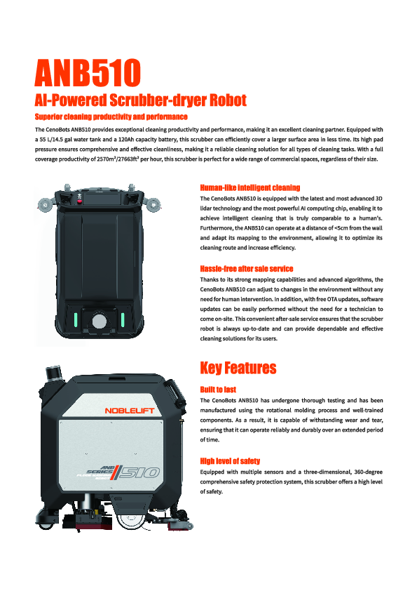 ANB510 — это передовое устройство, оснащенное искусственным интеллектом, что позволяет ему не только эффективно справляться с уборкой различных поверхностей, но и адаптироваться к разнообразным условиям работы. Этот робот выделяется своей высокой производительностью и безопасностью эксплуатации, что делает его идеальным решением для постоянного использования в промышленных, коммерческих и общественных пространствах.