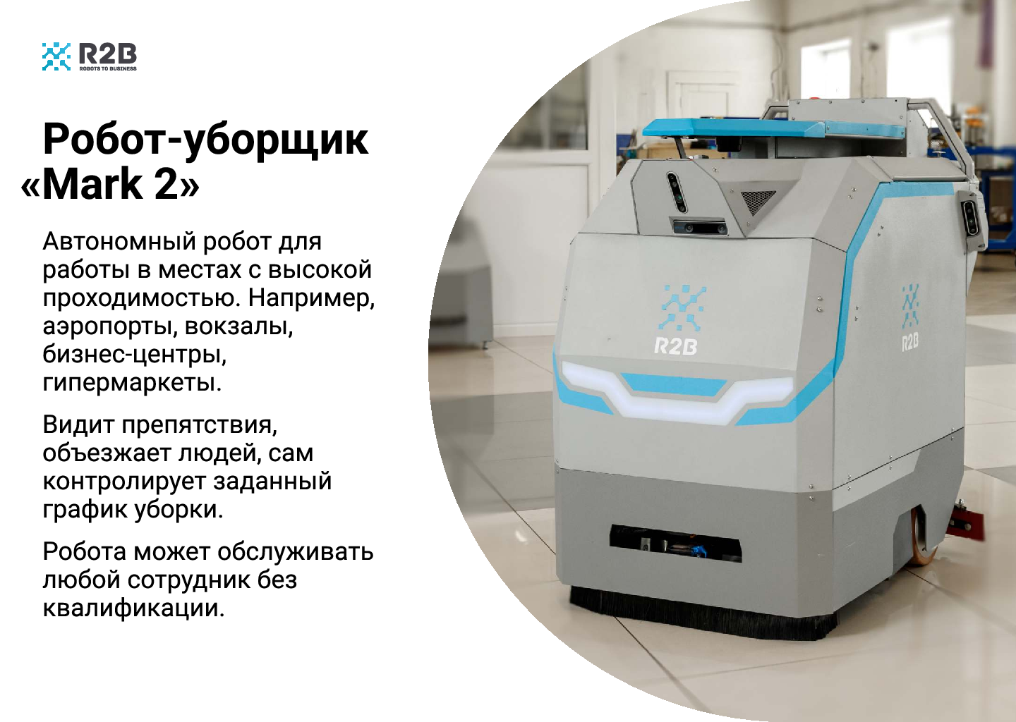 Компания «R2B» (Robots to business) — это российский производитель сервисных роботов и автоматических поломоечных машин для уборки пола. Она предлагает инновационные решения, которые помогают автоматизировать процессы уборки, снизить издержки и облегчить решение кадровых проблем.