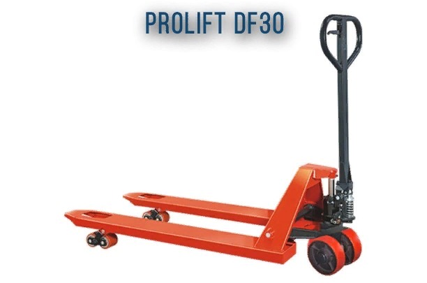 Ручная гидравлическая тележка PROLIFT DF 30 - высокоманевренная модель с углом поворота 180 градусов грузоподъемностью 3000 кг для транспортировки различных грузов и товаров на складе, производстве и в магазине.