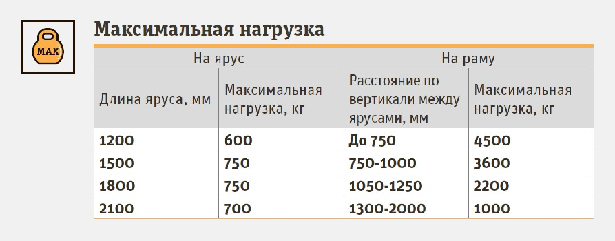 - на ярус хранения — от 600 кг до 750 кг (в зависимости от длины яруса).