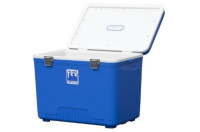 Пластиковый синий ящик с крышкой Techniice Компакт 18 Л (Австралия) - изотермический контейнер на 18 литров размерами 28х42,5х32 см для хранения и транспортировки замороженной продукции до 18 часов, при температуре окружающего воздуха +25°С + 28°С на производстве, складе и в магазине.