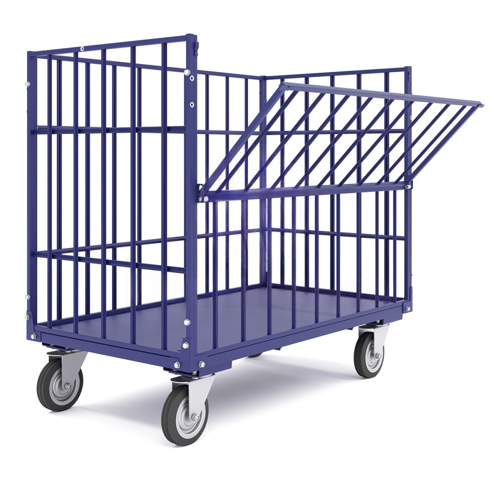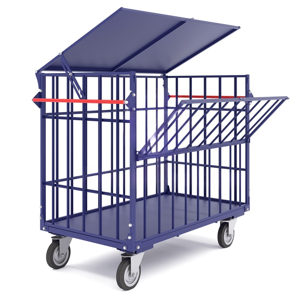 Металлический каркасный передвижной контейнер RUSKLAD КТМ 5 на колесиках, размером 700х1200 мм, с открывающейся фронтальной крышкой предназначен для удобного хранения и транспортировки различных грузов на складе, производстве или в магазине.