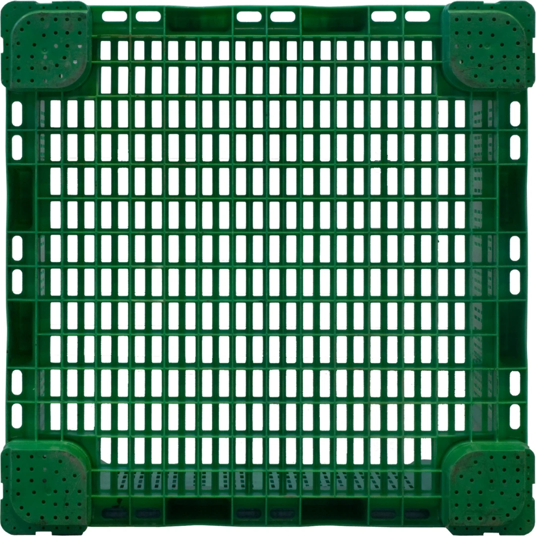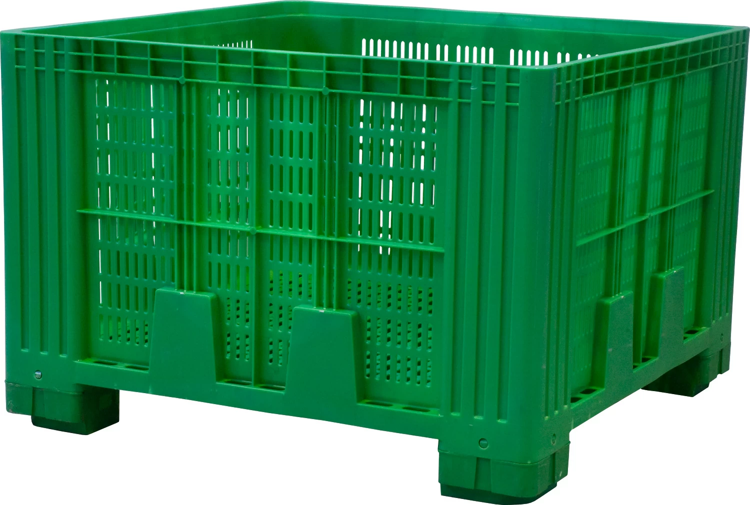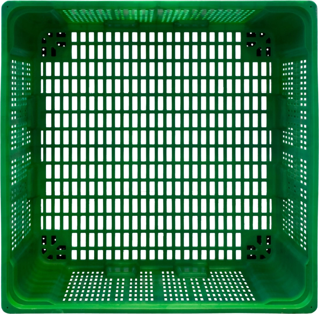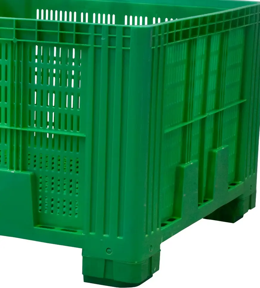 - Перфорированное дно и стенки крупногабаритных контейнеров из пластика арт. КБП - 1120 (зеленый) для постоянной циркуляции воздуха внутри контейнера.