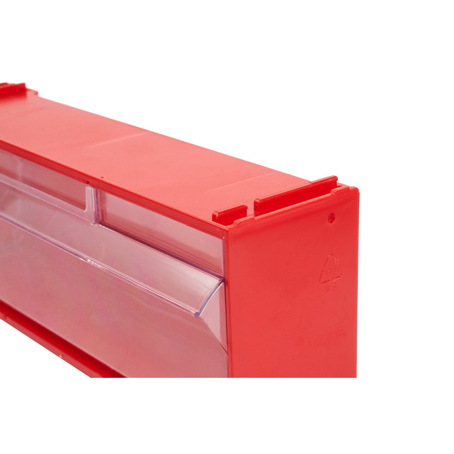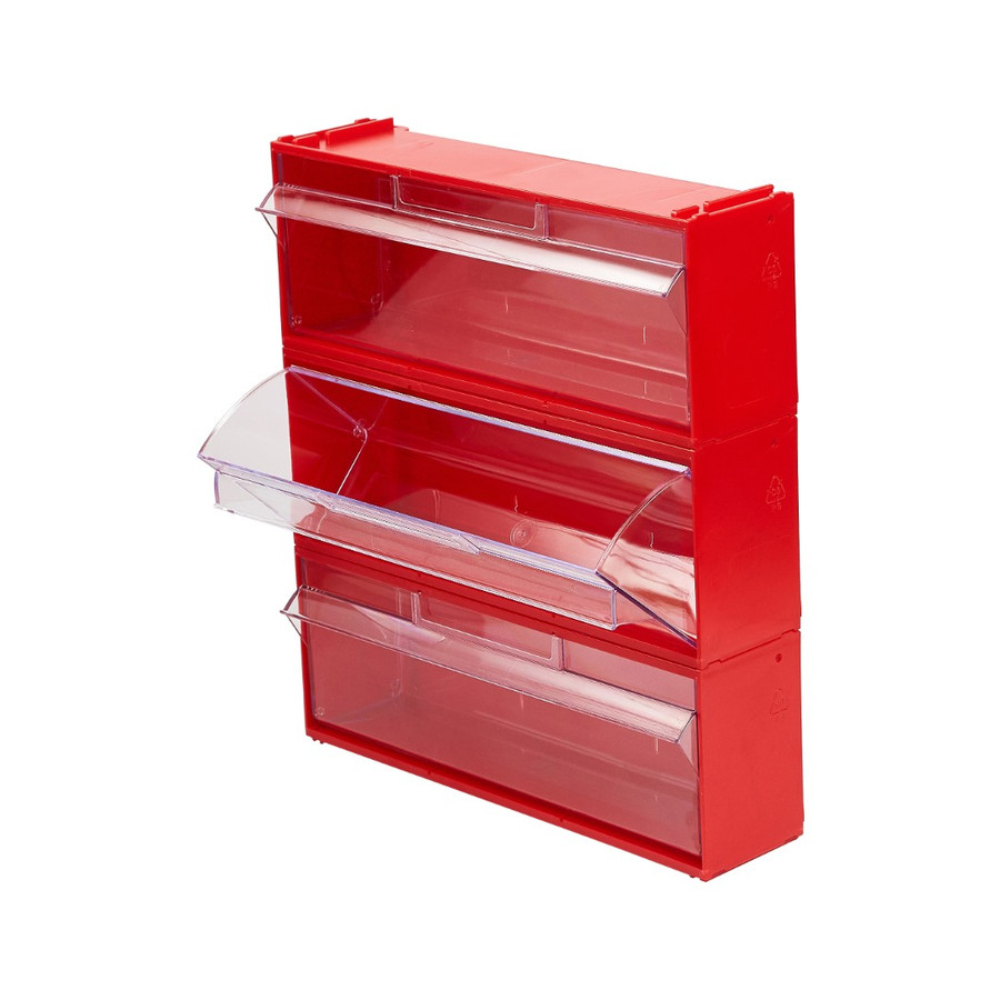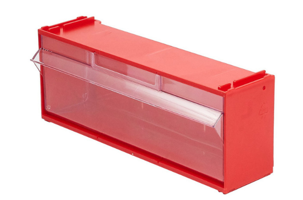 Пластиковый красный короб с откидным прозрачным ящиком ячейкой Стелла mini 102/1 (Россия) для хранения мелкоштучных изделий, запчастей, метизов, мелких деталей на складе, производстве, в магазине, СТО, дома в гараже. Пластиковые короба Стелла mini можно наращивать в высоту до нужных размеров, образуя модульную систему хранения для мелких деталей.