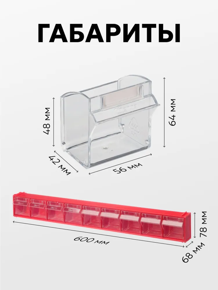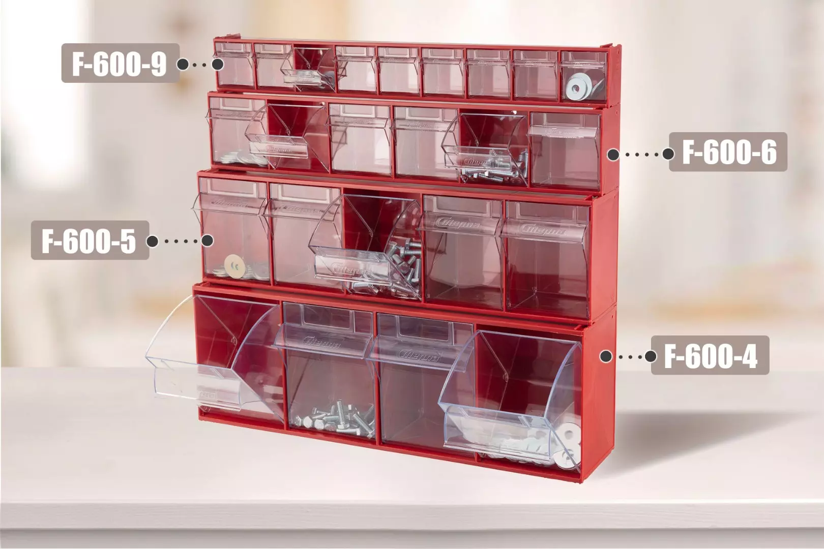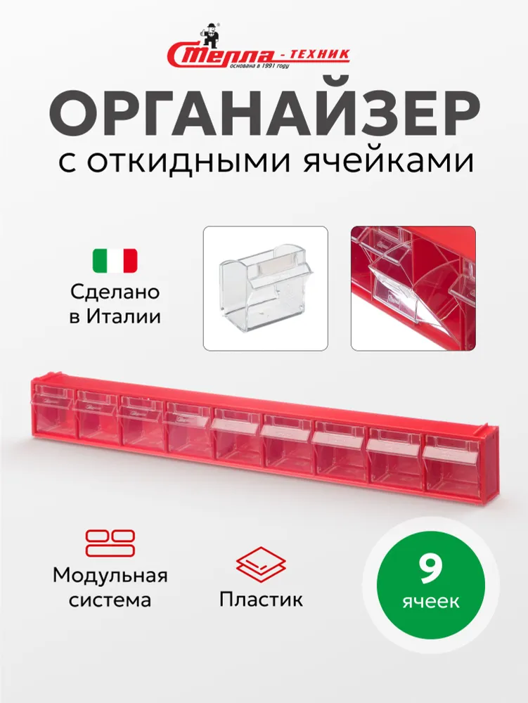 Пластиковый короб с откидными, съёмными прозрачными ячейками и лотками. В красном коробе Стелла-техник F-600-9 содержится 9 таких лотков, а его габариты составляют 600х68х78 мм. Изготовлен в России. Предназначен для хранения мелкоштучных изделий, запчастей, метизов и мелких деталей на складах, производствах, в магазинах, на СТО, а также дома в гараже.