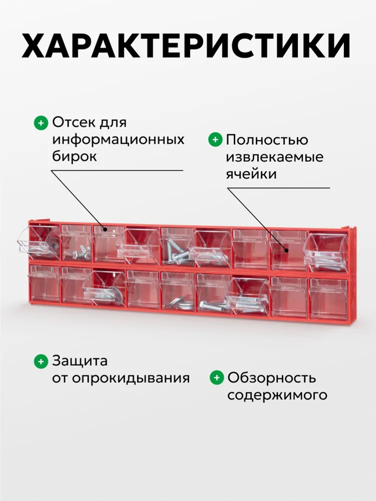 Короба с откидными ячейками представляют собой один из самых практичных и удобных способов хранения множества мелких деталей, метизов, запасных частей и фурнитуры. Они отлично подходят для использования в различных помещениях: магазинах, складах, лабораториях, производственных и бытовых пространствах, а также в гаражах и на станциях технического обслуживания.