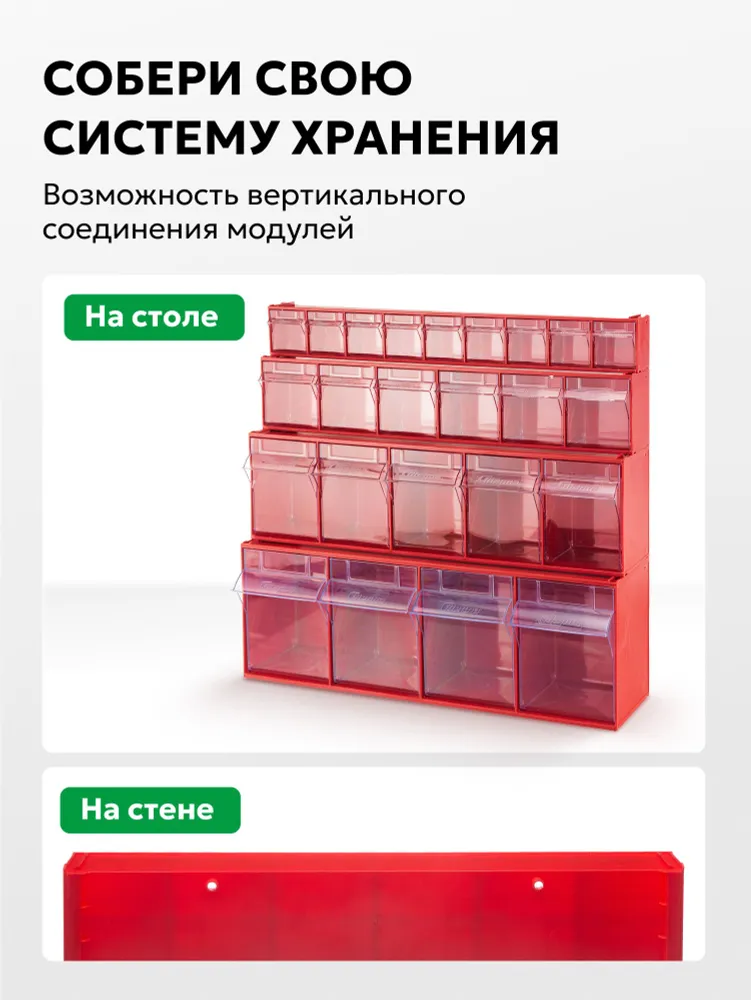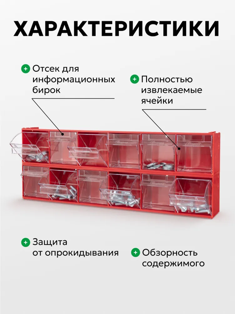 Короба с откидными ячейками — одно из самых практичных и удобных решений для эффективного хранения большого ассортимента мелких деталей, метизов, запасных частей, фурнитуры и т.п. Они идеально подходят для размещения в магазине, на складе, лабораториях, производственных и бытовых помещениях, в том числе в гараже и на станции СТО. Благодаря системе раздельно-открывающихся прозрачных отсеков, любые мелкие материалы тщательно и наглядно рассортированы и легкодоступны. При необходимости откидную ячейку лоток при необходимости можно легко снять и работать отдельно на своем рабочем месте.