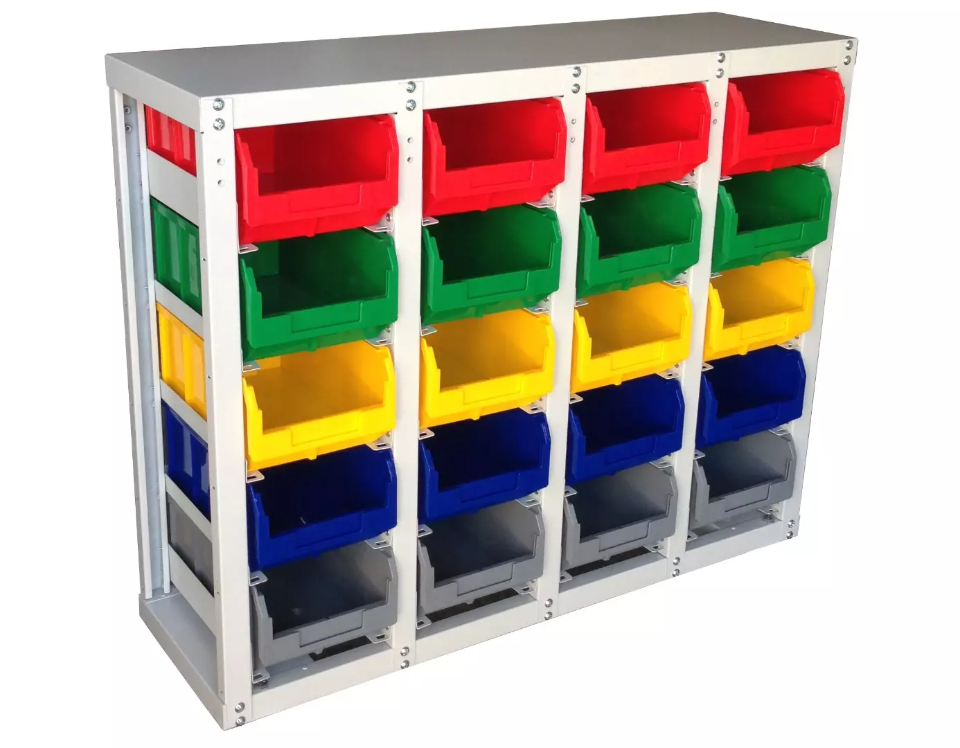 Односторонний стационарный стеллаж стойка СТЕЛЛА V3-20 с направляющими для размещения пластиковых ящиков лотков 20 шт. предназначен для организации складских систем хранения и рабочих мест на сборочных производствах, в торговых и складских помещениях, в автомобильных мастерских СТО.