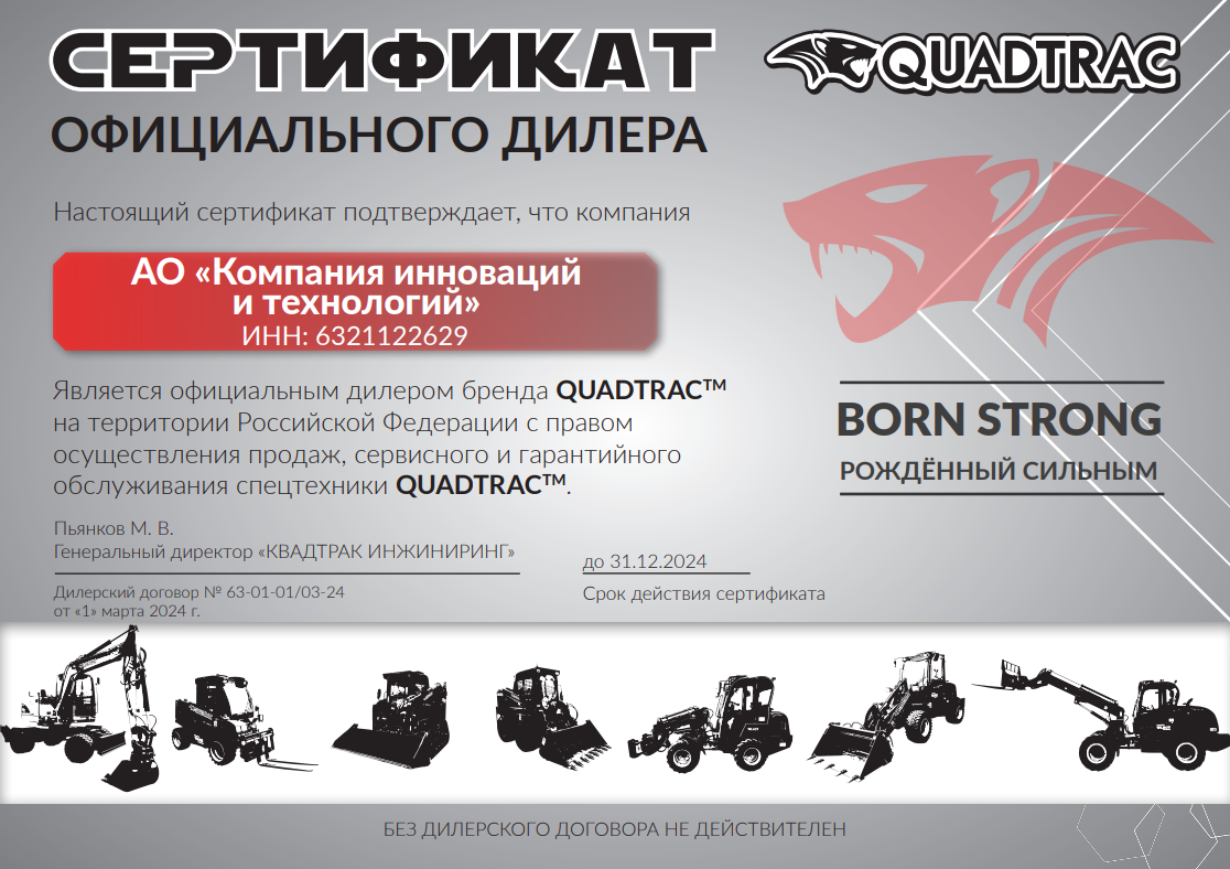 АО "Компания инноваций и технологий" (КИИТ) представляет фронтальные мини-погрузчики QUADTRAC. Эти машины подходят для строительства, сельского хозяйства, производства, коммунальных служб и ландшафтных работ.