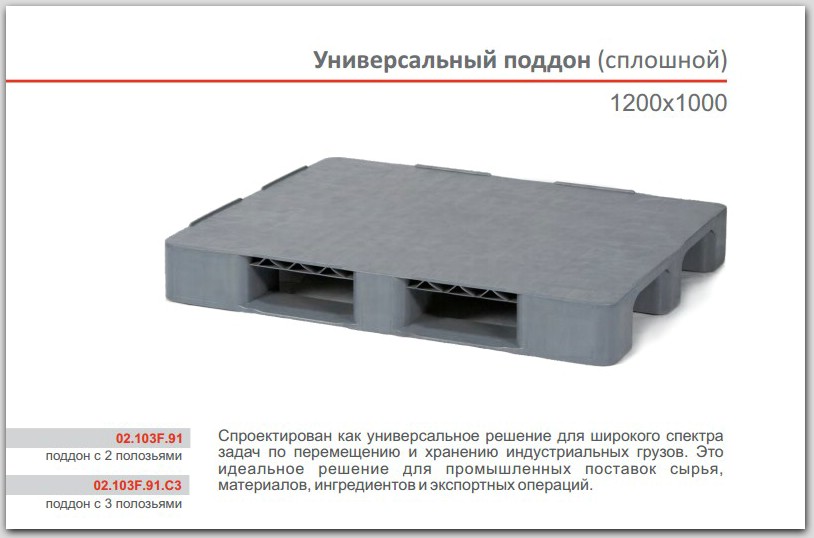 Универсальные полимерные поддоны являются универсальным решением широкого спектра промышленных задач по перемещению и хранению грузов во многих отраслях промышленности и торговли. Особенно популярны в складском хозяйстве, в пищевой индустрии, фармацевтике, розничной торговле, в цепочках поставках деталей и комплектующих, сырья и ингредиентов. Адаптированы для применения в автоматизированных складских системах.