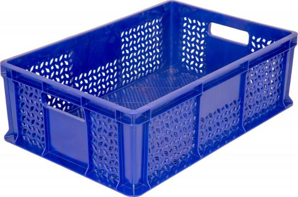 - Полностью перфорированный пластмассовый ящик с ручками размера 600*400*180 мм имеет объем 35 л.