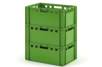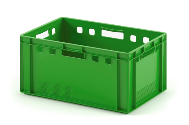 Пластиковый штабелируемый мясной ящик E2 12.423 размерами 600х400х300 мм для хранения и транспортировки мяса и мясных продуктов на складе и в магазине. Ящик E3 отлично подходит для хранения мяса в холодильных и морозильных камерах.