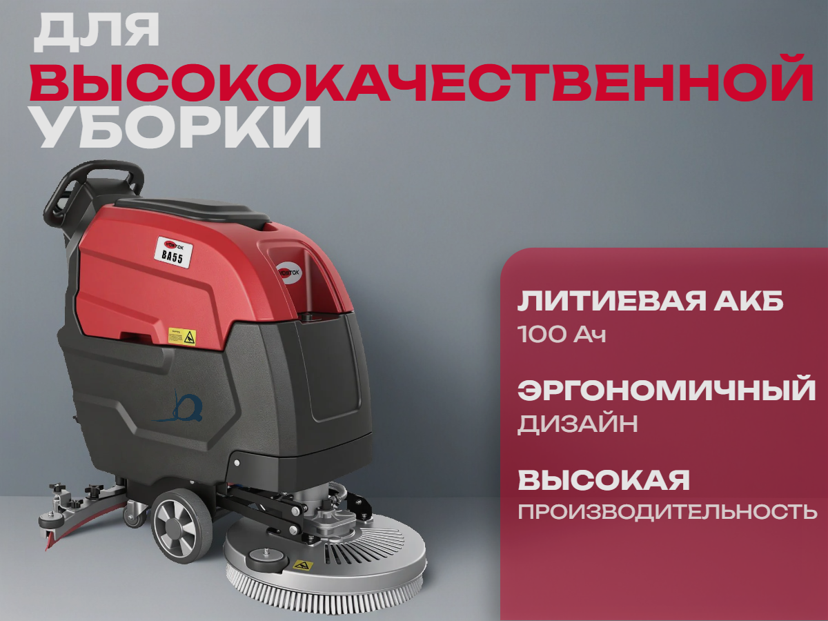 Ручная аккумуляторная поломоечная машина VOSTOK BA55T (привод хода) с литиевой батареей емкостью 100 Ач идеально подходит для быстрой уборки и мойки средних по площади помещений, таких как супермаркеты, коммерческие, складские и производственные объекты.