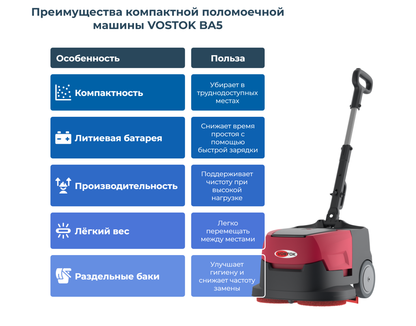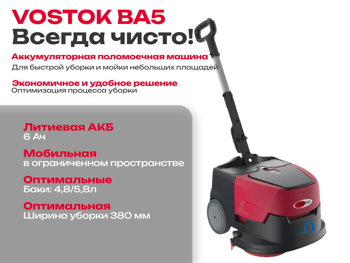 Поломоечная машина VOSTOK BA5 — это экономичное и удобное решение для уборки небольших и средних помещений