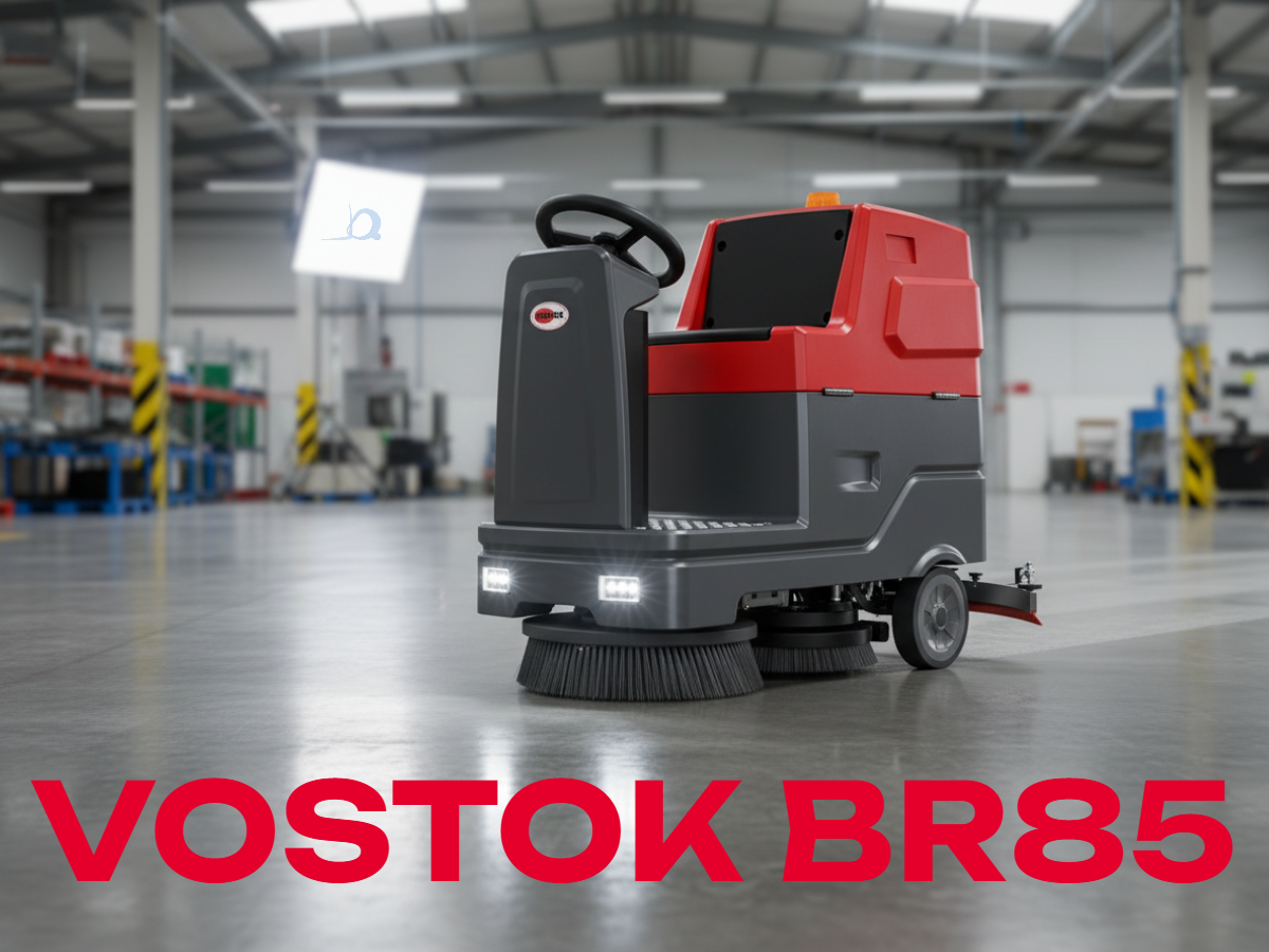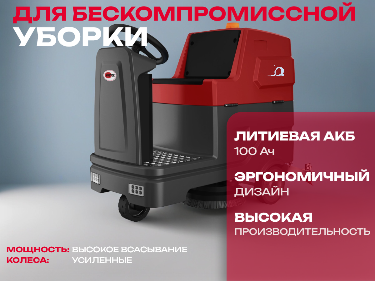 Поломоечная машина с местом для оператора и литиевой АКБ VOSTOK BR85 (Китай) для генеральной и поддерживающей уборки в помещениях от 1 000 до 6 000 м2 супермаркетов, коммерческих, складских и производственных помещений.