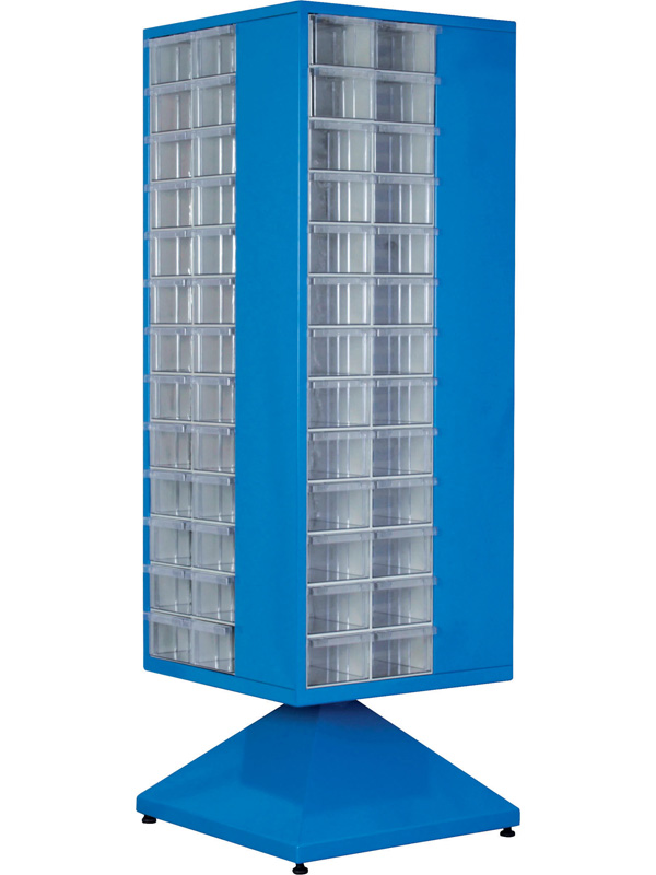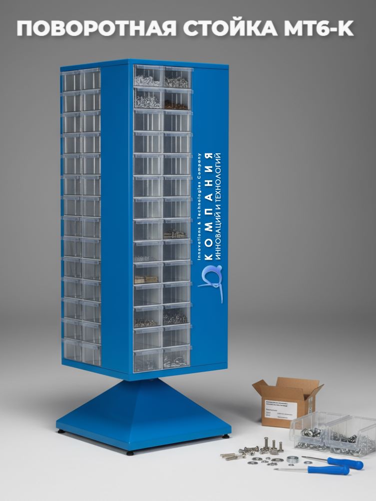 Поворотная голубая стойка в комплекте с выдвижными прозрачными лотками ячейками MT6-K - универсальный вращающаяся стеллаж, стойка, органайзер, шкаф размерами 610х610х1840 мм для хранения метизов и мелкоштучной продукции на производстве, складе, СТО и в магазине.