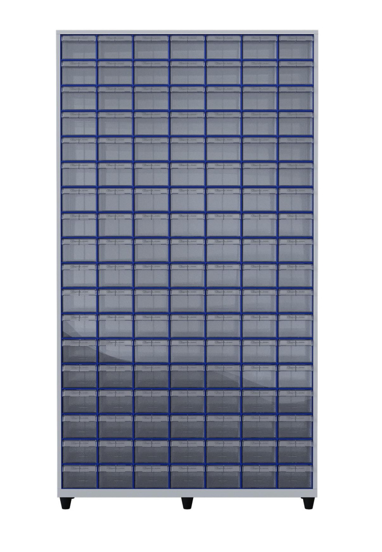 Шкаф вмещает 126 пластиковых коробов С-2, каждый из которых имеет размеры 250х140х100 мм. Прозрачные внутренние контейнеры позволяют быстро находить нужные вещи, так как их содержимое всегда видно. Извлечение внутреннего короба осуществляется легко, как у спичечного коробка, что делает процесс заполнения и опустошения шкафа очень удобным.
