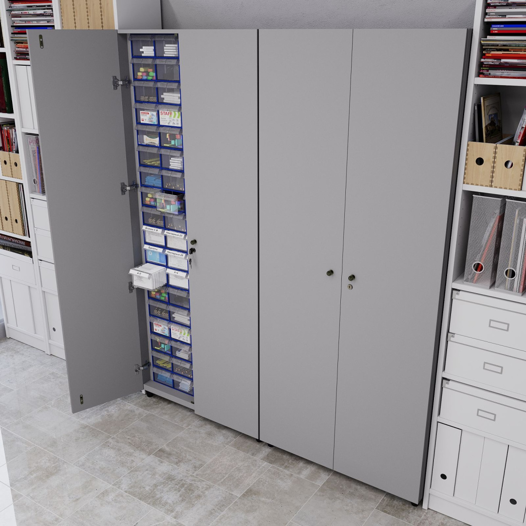 Одним из популярных решений является шкаф в сборе Стелла-техник С-2-90-Д. Этот шкаф рассчитан на 90 пластиковых контейнеров и станет отличным дополнением для любого помещения. Он выполнен из серого ламинированного ДСП, а контейнеры представлены в синем и прозрачном цветах, что обеспечивает удобство в организации хранения.
