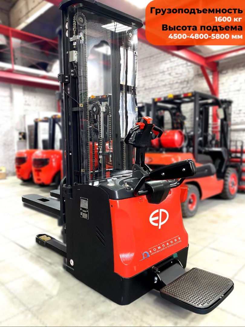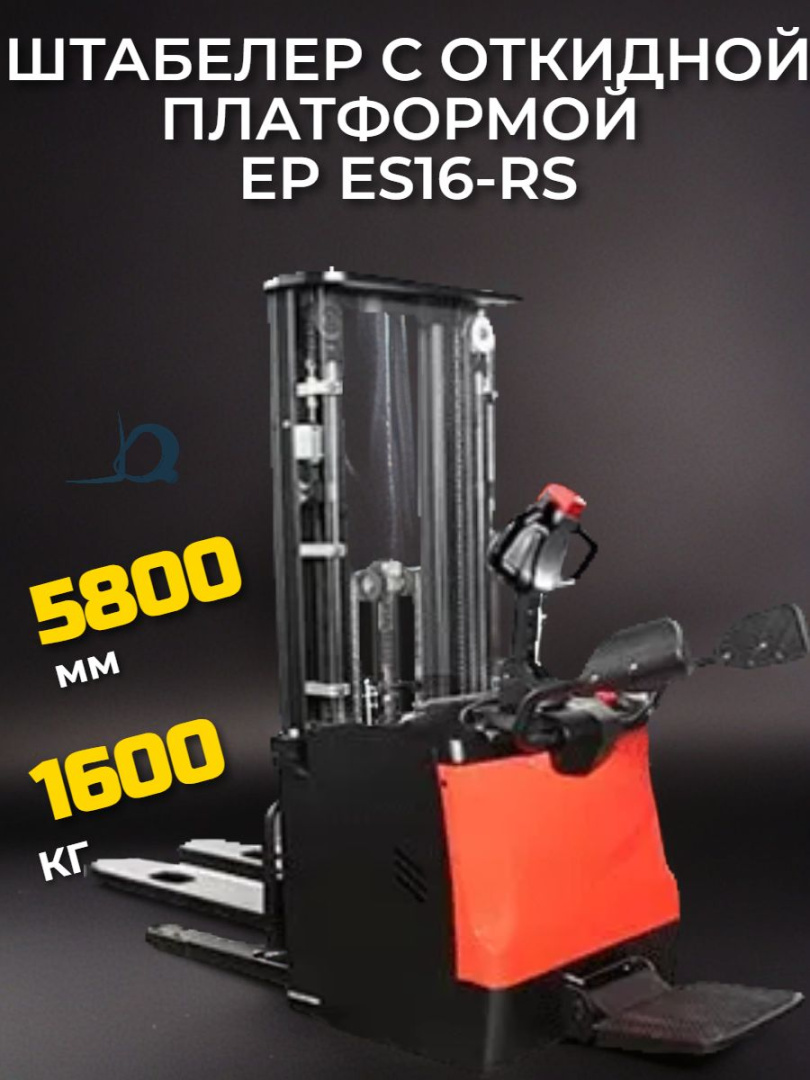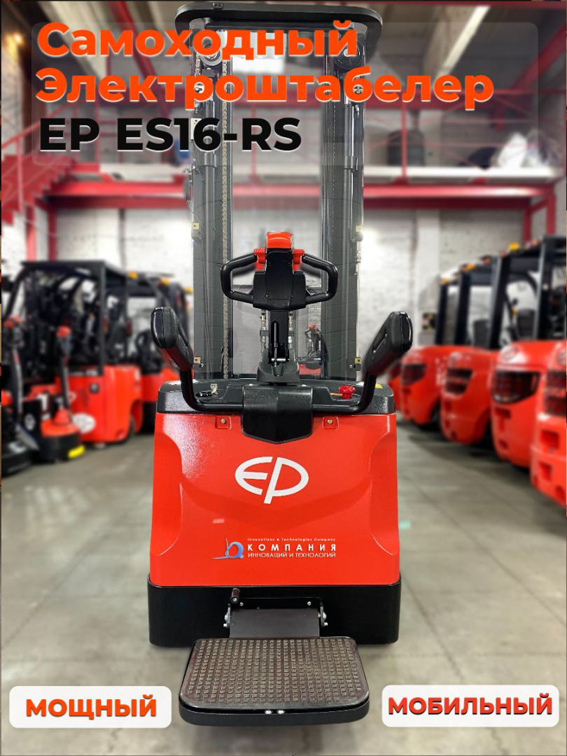 Электрический самоходный штабелер с откидной платформой и ограждением для оператора EP ES16-RS (Китай) для транспортировки и подъема грузов до 1600 кг на высоту до 5,8 метров на складе, производстве и в магазине.