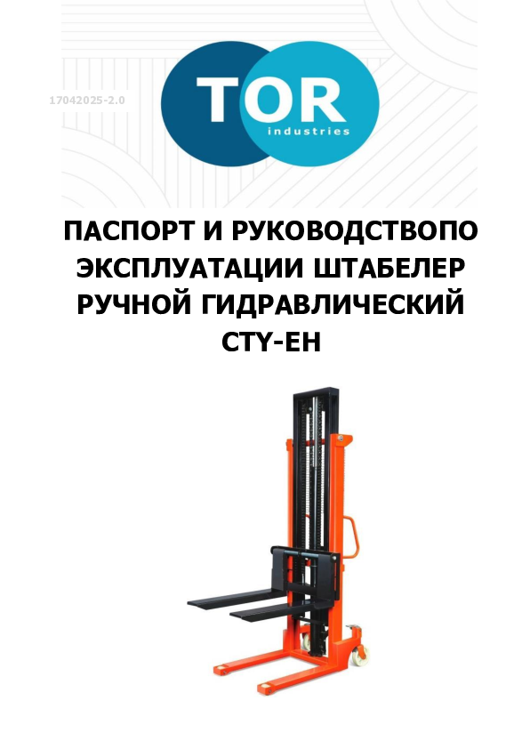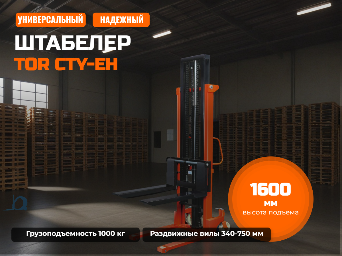 Ручной штабелер TOR CTY-E представляет собой универсальное решение с раздвижными вилами. В линейке представлено три модели с различной грузоподъемностью: 1000, 1500 и 2000 кг, а максимальная высота подъема составляет 1,6 м.