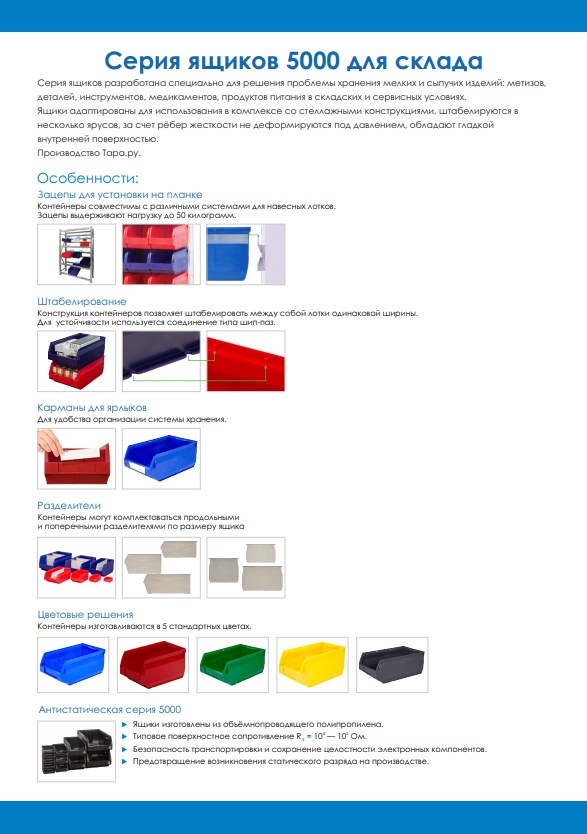 Для организации хранения различных мелких деталей и товаров на полочных и навесных стеллажах АО "Компания инноваций и технологий" предлагает удобные и недорогие складские контейнеры серии Italia 5000 российского производства.