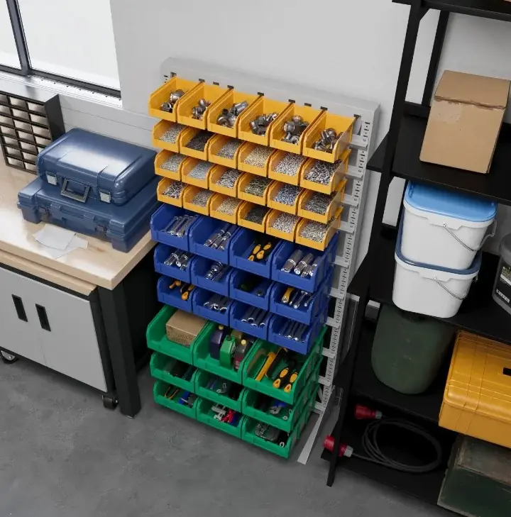 В комплект поставки входят 32 шт. пластиковых ящиков лотков различных размеров и цвета, которые используются для хранения мелкоштучных товаров, мелких деталей и ТМЦ. Наличие с лицевой стороны бирки позволяет найти нужное изделие в течении нескольких секунд.