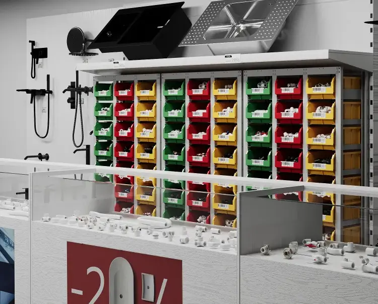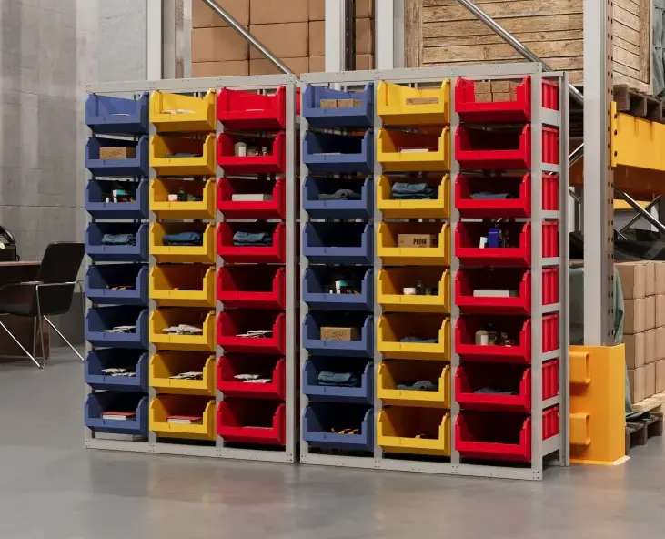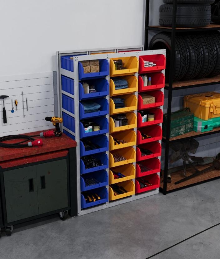 В комплект поставки входят 24 разноцветных пластиковых ящика V4, которые используются для хранения мелкоштучных товаров, мелких деталей и ТМЦ. Наличие с лицевой стороны бирки позволяет найти нужное изделие в течении нескольких секунд.