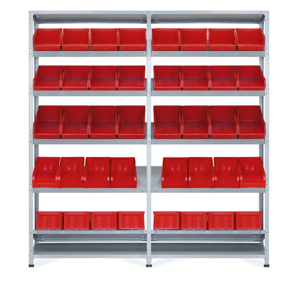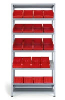 Универсальный полочный стеллаж ДиКом СТ-012 используется для хранения различных мелких грузов в пластиковых ящиках, установленных на наклонные полки.