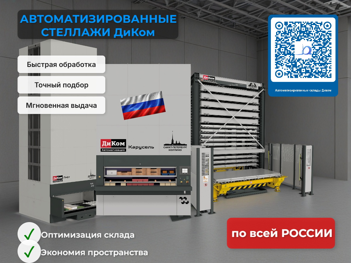 Автоматизированная стеллажная система элеваторного типа построена на базе автоматизированной складской системы «ДиКом-Карусель», разработанной и произведённой в России.