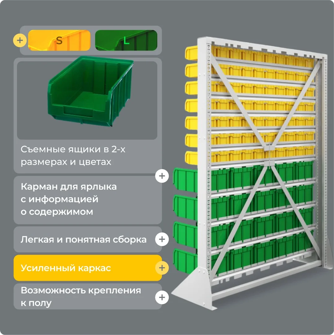 В комплект поставки входят разноцветные пластиковые ящики лотки различных размеров и цвета, которые используются для хранения мелкоштучных товаров, мелких деталей и ТМЦ. Наличие с лицевой стороны бирки позволяет найти нужное изделие в течении нескольких секунд.