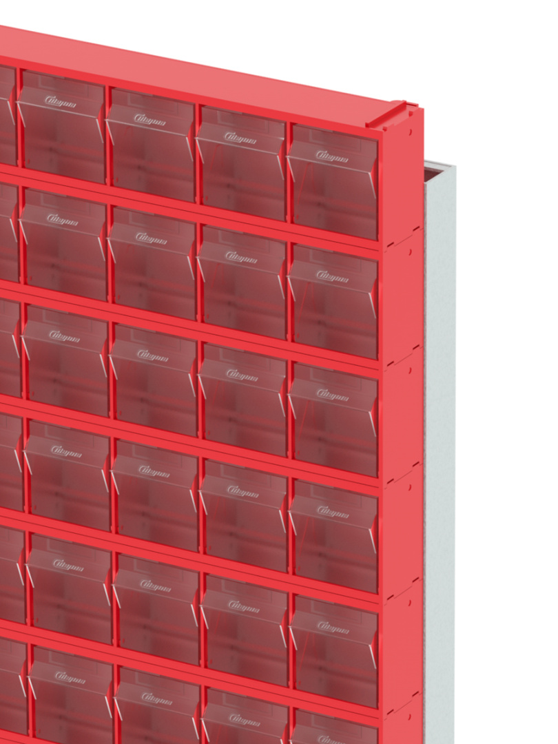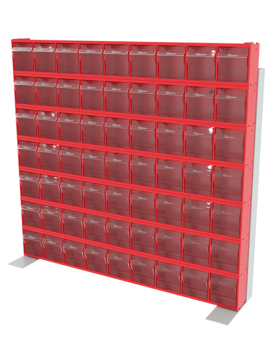 Модульная система хранения - настольная (настенная) стойка Стелла-техник 401-07-00-00 (605х150х500) с откидными коробами и съемными прозрачными ячейками для хранения мелкоштучного товара и изделий на складе, производстве, в магазине, гараже.