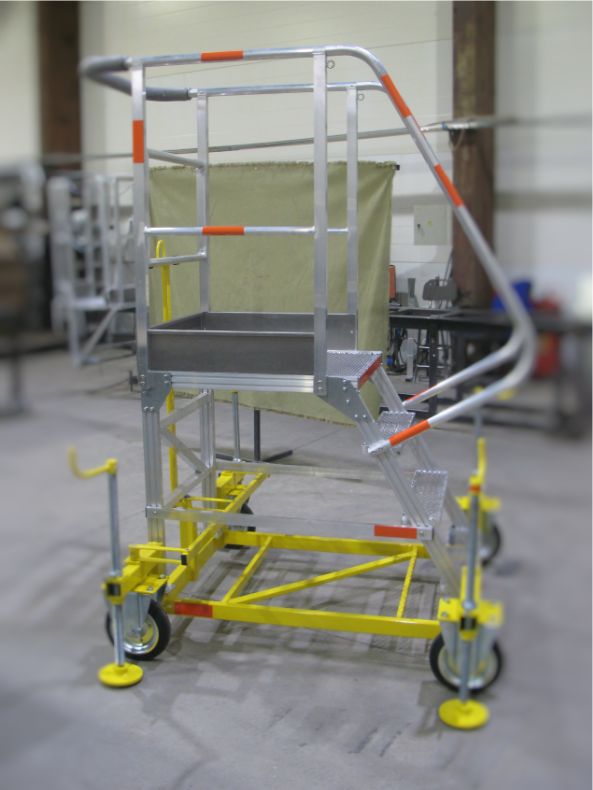 Авиационные вышки стремянки предназначена для обеспечения доступа обслуживающего персонала к высокорасположенным узлам при проведении регламентных работ и технического обслуживания летательных аппаратов и других изделий и конструкций на местах стоянок, в крытых доках и ангарах.