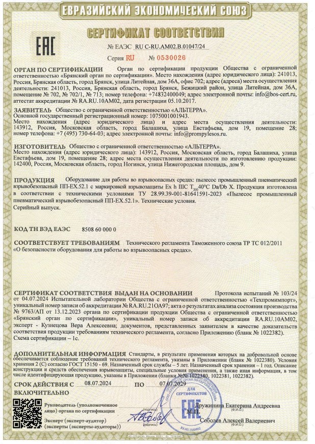 Пылесос имеет маркировку взрывозащиты, соответствующую требованиям ГОСТ 31610.0: Ex h IIIC T20040℃ Da/Db X. Это означает, что он может использоваться в условиях, где возможно образование взрывоопасных смесей категорий IIIA, IIIB и IIIC, при температуре от -20 до +40 градусов Цельсия.