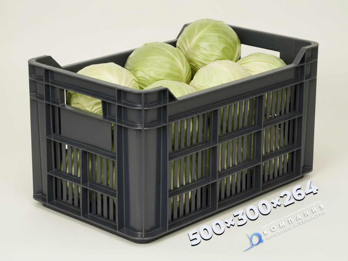 Универсальный дизайн: стандартные размеры 500×300×264 мм позволяют использовать наши ящики на любых стеллажах или в грузовых автомобилях.